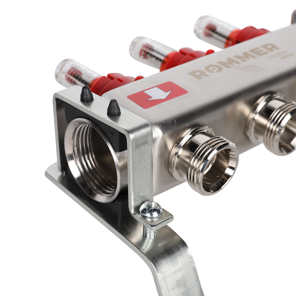 Коллектор из нержавеющей стали Rommer в сборе с расходомерами на 3 выхода широко используется в системах водяного теплого пола или для подключения отопительных приборов. Производство коллекторных блоков осуществляется из высококачественных материалов, с применением тщательного контроля, многочисленных тестов и сертификации продукции.