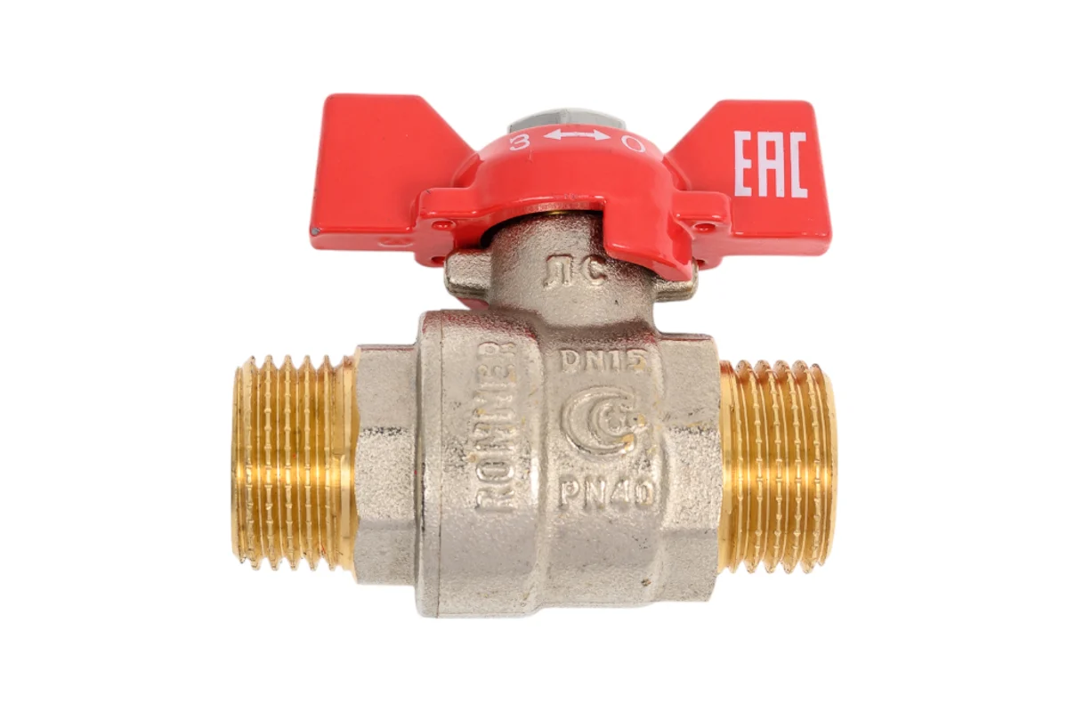 корпус - Никелированная латунь, рукоятка - Бабочка, Резьба Н/Н 1/2”, номинальное давление 40 бар, раб.t от -20 до 130°С для Вода, пар, жидкие среды неагрессивные к материалам изделия