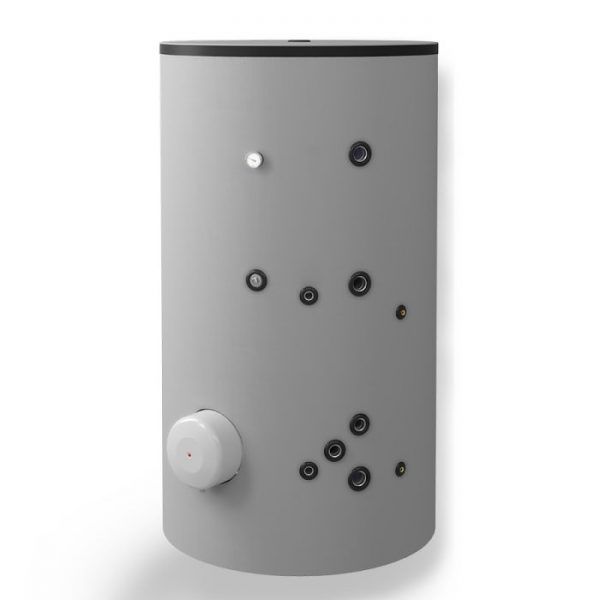 - В базовой комплектации прибор оборудован термометром, который показывает актуальную температуру внутри бойлера, гильзами для котловых датчиков, входом рециркуляции, защитным кожухом ПВХ который крепится и снимается при помощи молнии. В комплектации поставляются предохранительный клапан и заглушки для отверстий.