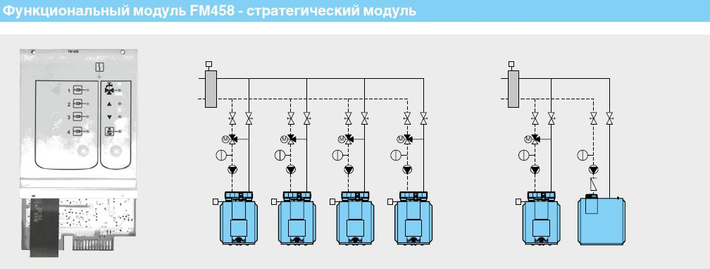 Функциональный модуль Buderus FM458 является стратегическим модулем для котлов средней и большой мощности. Функциональный модуль может управлять установкой из нескольких котлов как в последовательном, так и параллельном режиме.
