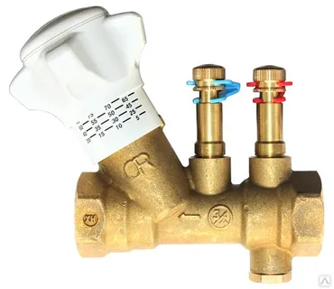 Ручной балансировочный клапан с фиксированным проходом (основан на принципе Вентури). Латунный корпус с внутренней - внутренней резьбой и сливом. Рукоятка из пластика ABS с нанесенным значением KV устройства Вентури. Возможность регулировки с блокировкой установленной настройки (механическая память). Доступны в модификациях с штуцерами для измерения дифференциального давления, или без них.