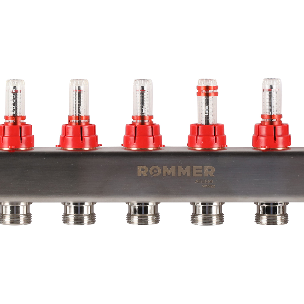 Коллектор Rommer с расходомерами, с клапаном выпуска воздуха и сливом широко используется в системах водяного тёплого пола или для подключения отопительных приборов. Производство коллекторных блоков осуществляется из высококачественных материалов, с применением тщательного контроля, многочисленных тестов и сертификации продукции.