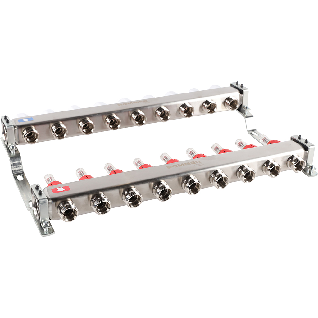 Коллектор из нержавеющей стали Rommer в сборе с расходомерами на 9 выходов широко используется в системах водяного теплого пола или для подключения отопительных приборов. Производство коллекторных блоков осуществляется из высококачественных материалов, с применением тщательного контроля, многочисленных тестов и сертификации продукции.