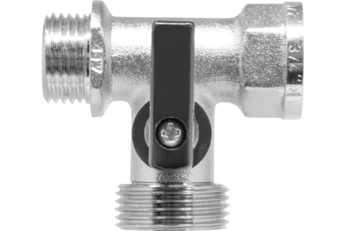 корпус - Хромированная латунь, рукоятка - Ручка, Резьба В/Н/Н 1/2” х 3/4” х 1/2”, номинальное давление 16 бар, раб.t от -20 до 95°С для Вода