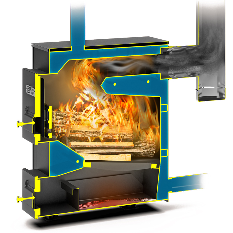 - Глубокая наклонная топка для использования длинных дров и равномерного распределения угля по всей глубине топки при засыпке.