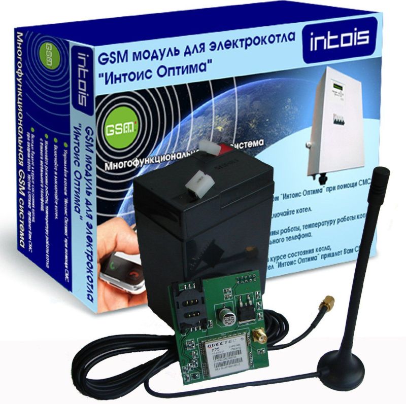 GSM-модуль производится компанией «Интоис» специально для электрических котлов отопления серии «Интоис Оптима». Он предназначен для дистанционного контроля и управления котлом по GSM-каналу (посредством SMS-сообщений). Для работы модуля требуется установка SIM-карты (приобретается отдельно).