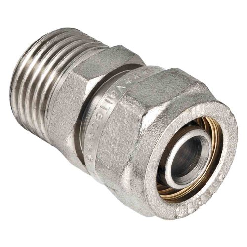 Никелированная латунь, Обжим / Резьба Цанга / Н 26 мм х 1”, номинальное давление 10 бар, для Вода, пар, жидкие среды неагрессивные к материалам изделия, совместим с Металлопластиковые трубы, трубы из сшитого полиэтилена