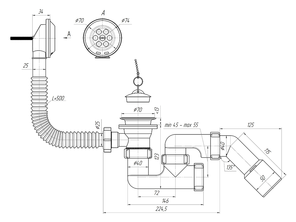 Сифон для ванны регулируемый с выпуском 1 1/2”х40, с переливом и переходной трубой 45° 40/50 АНИ Пласт E251
