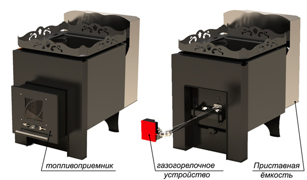 По желанию потребителя приобретаемое оборудование может функционировать на газе из сети или сжиженном углеводородном топливе из баллона. В таком случае потребуется монтаж газовой горелки. Согласно расчетам производителя, она прослужит не менее десяти лет. Печь банная RST 32 кВт/т (жаропрочная легированная сталь 09Г2С, толщина каменки 8 мм, обшивка AISI, модель под теплообменник) будет осуществлять обогрев помещения и жидкости от использования дров, если устанавливается теплообменник.