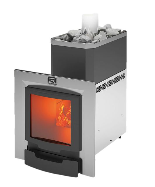 отапливает до 12м³ топливом: Дрова, газ, дымоход Ø 115мм, Большой светопрозрачный экран, корпус Нержавеющая сталь, каменка - Открытый на 50кг камней, габариты 335х810х737мм