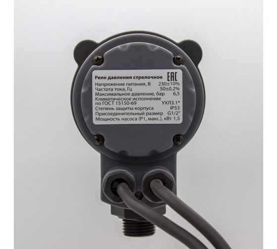 для насоса до 1500Вт, присоединение 1/2”, напряжение 230В, настройка давления от 0 до 6,5 бар +/-10% при t воды от +5° до +35°C, защита от сухого хода - есть, откл/30/180 сек.
