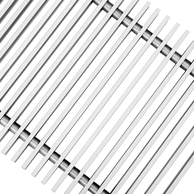 Решётка для внутрипольного конвектора выполнена из анодированного алюминия, за счёт чего изделие устойчиво к коррозии и механическому износу. Удачно подобранное расстояние между пластинами решётки (10 мм) обеспечивает высокую степень теплопередачи и одновременно придаёт конвектор эстетичный внешний вид.