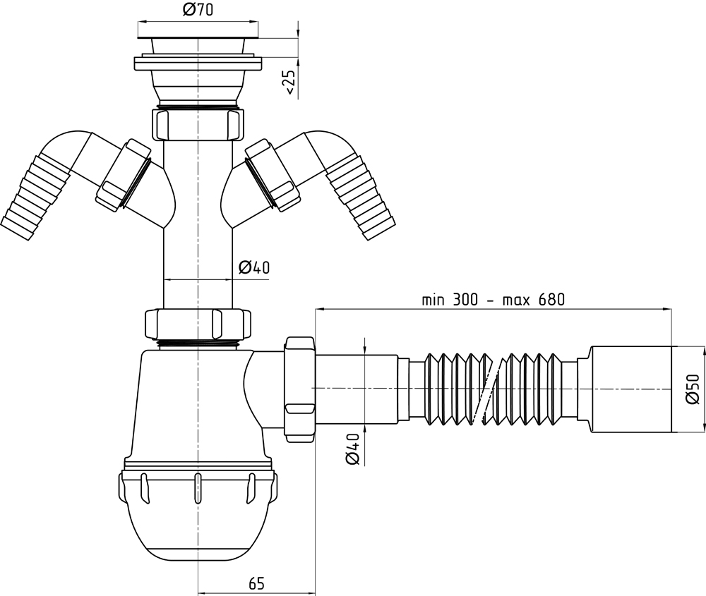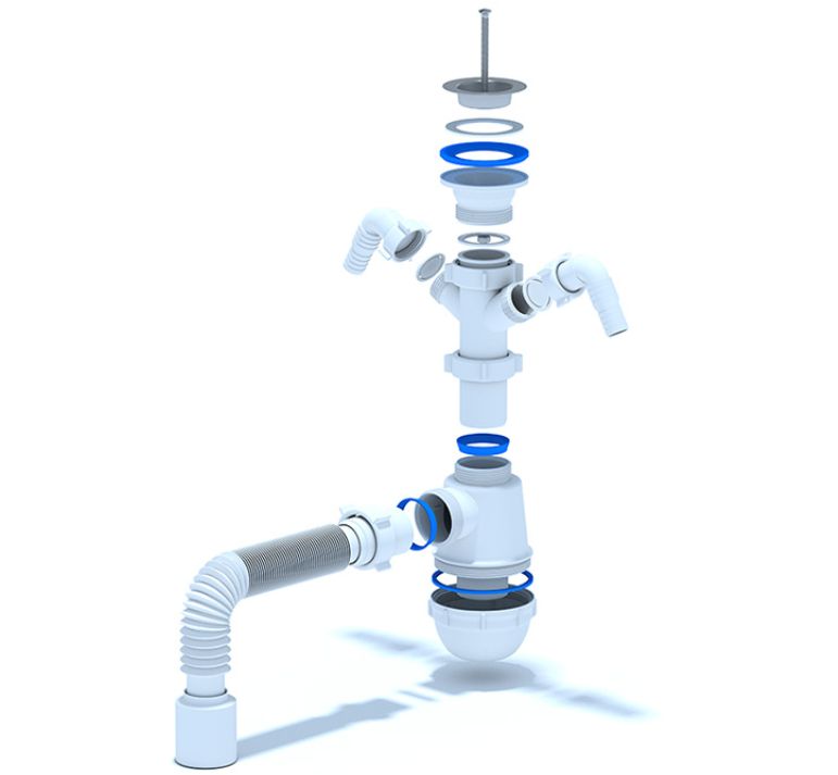 Сифон для кухонных моек с диаметром сливного отверстия 50мм, бутылочного типа с увеличенным корпусом. С разборным выпуском и нержавеющей решеткой, с двумя отводами для подключения бытовой техники. Для подключения к канализации комплектуется гибкой трубой 40*50мм