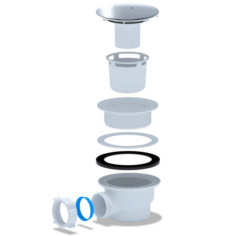 Пластиковый сифон для душевого поддона, монтажная высота 77 мм, подключение к сантехнике Ø90 мм, подключение к канализации Ø40 мм, цвет крышки: хром.