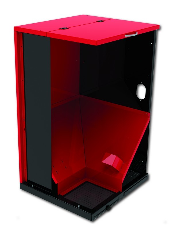 В базу бункера интегрированы сливные отверстия, и контейнер для сбора пыли для облегчения чистки бункера от пеллет в отсутствии потребности ожидания его опустошения.