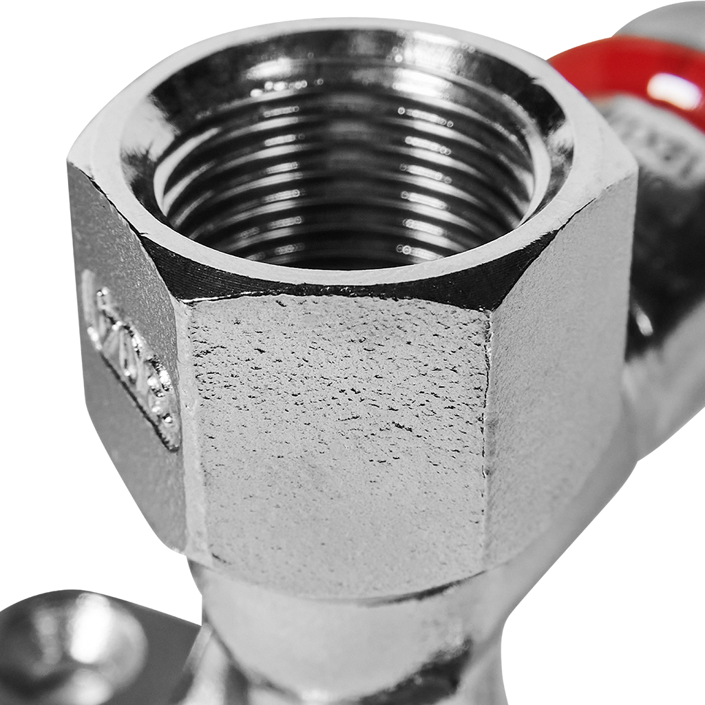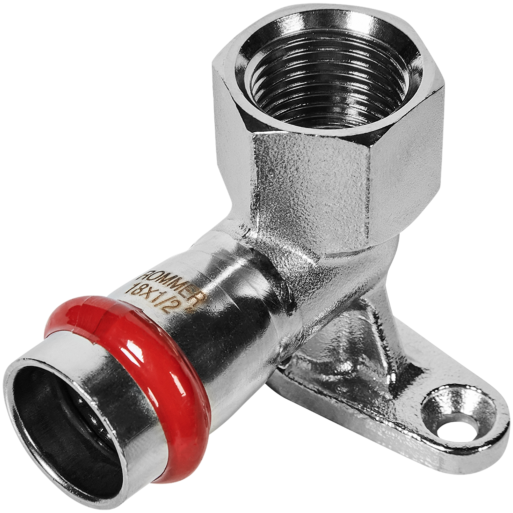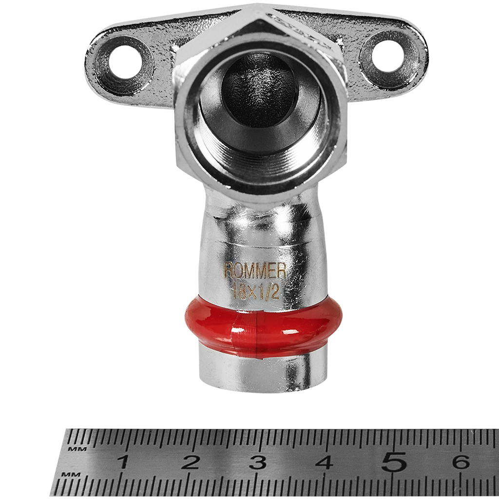 ROMMER - настенный угольник из нержавеющей стали размером 18 мм и резьбой ½", оснащённый крепежом для удобного монтажа на стене. Применяется в системах отопления и горячей воды для создания герметичных соединений между элементами.
